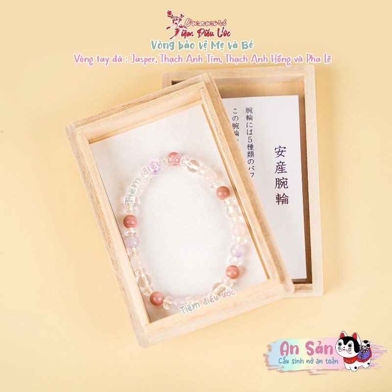 Vòng đeo tay, kích thước cổ tay tối đa 15.5cm với 5 loại đá khác nhau: Jasper, Thạch Anh Tím, Thạch Anh Hồng và 2 kiểu pha lê