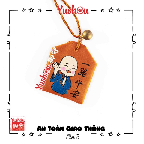 Điểm nhấn chính là hình ảnh một chú tiểu đáng yêu, đầu trọc, mặc áo nâu, đang mỉm cười và vẫy tay, tượng trưng cho sự bình an, thanh tịnh và may mắn trên mọi nẻo đường. Phía bên phải chú tiểu là các ký tự Hán tự "一路平安" (Nhất Lộ Bình An), có nghĩa là "một lộ bình an", thể hiện rõ mục đích của yushou. Yushou được buộc bằng sợi dây màu cam đồng điệu, thắt nút trang trọng, đi kèm một chiếc chuông vàng nhỏ xinh, được tin là sẽ ngân lên âm thanh của niềm vui và sự an toàn khi di chuyển. yushou có dây dài, thích hợp cho bạn treo vào cặp, móc khóa hoặc dành để tặng người thân bạn bè mình nhé!