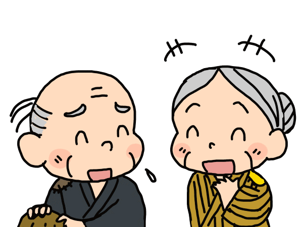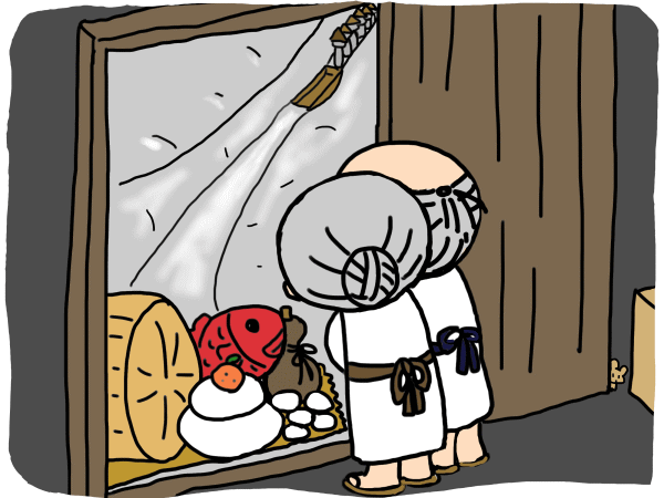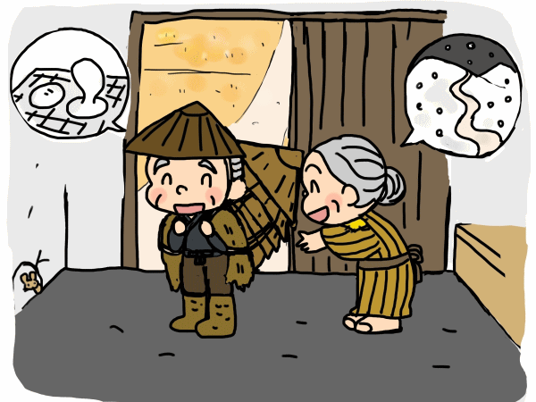 Tối hôm đó ông bà đang ngủ thì bên ngoài có tiếng động như có ai đang để cái gì nặng lắm ở bên ngoài. Tiếng động này làm ông bà lão thức giấc. Ông bà sợ hãi mở cửa xem chuyện gì, thì lạ lùng thấy trước cửa nhà chất đầy những chiếc bánh dầy thật to cùng với gạo, rau và cá. “Cảm ơn, cảm ơn. Thế này thì lão ăn tết to rồi. Nhưng ai lại đem đến cho lão những thức ăn này nhỉ?”. Ông bà lão ngơ ngác chưa hiểu chuyện gì, đảo mắt nhìn quanh thì thấy bóng sáu vị Địa Tạng đang xếp hàng đi ngoài kia. Tất cả các tượng Địa Tạng đều đội nón, nhưng tượng đi sau cùng thì đội khăn.