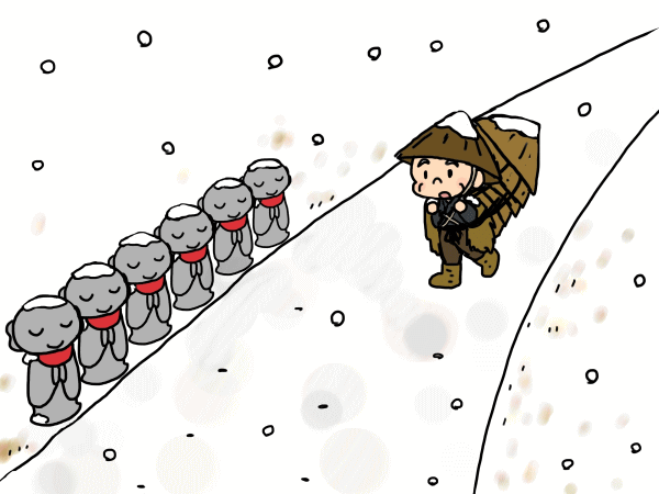 Về đến đầu làng ông thấy có 6 tượng Bồ tát Địa Tạng, tượng nào trên đầu cũng bị tuyết phủ trắng.
