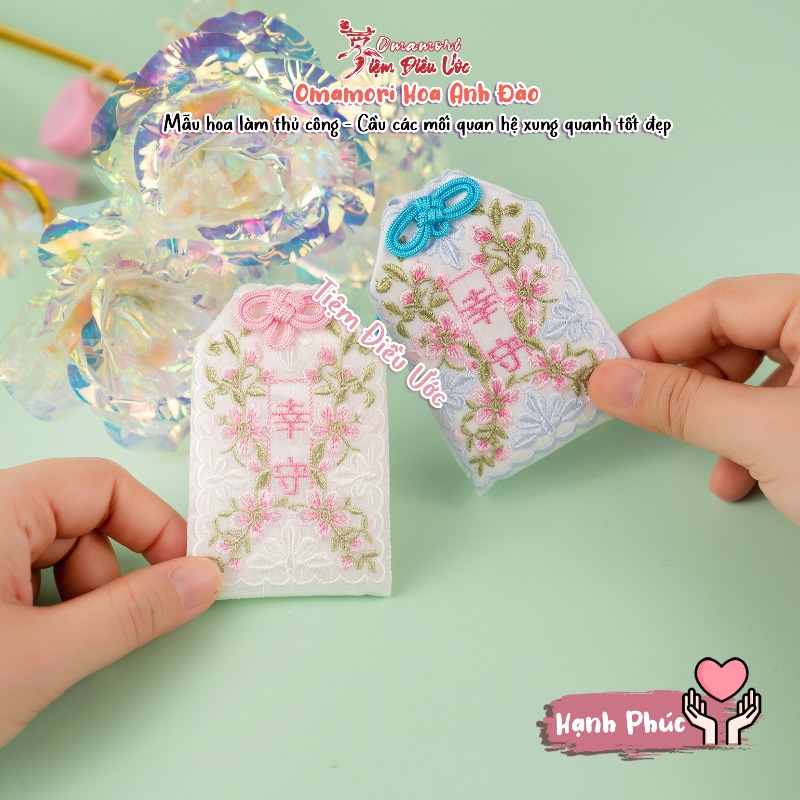 Ý nghĩa: :#hạnh_phúc - Cầu các mối quan hệ xung quanh tốt đẹp, nhận được nhiều sự giúp đỡ từ mọi người xung quanh! #Omamori này khá dày, là mẫu ren và thêu hoa lên, vẫn có tên Chùa ở mặt sau, có 2 màu như ảnh ạ.