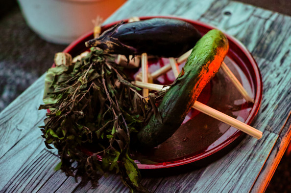 Người ta thường trang trí dưa chuột và cà tím cắm bằng que tăm hoặc đũa được gọi là "Ngựa linh thiêng". Dưa chuột là ngựa, cà tím là bò, có ý nghĩa là "những người đã khuất sẽ lên ngựa để nhanh chóng trở lại trần gian, sau đó sẽ cưỡi bò để thong thả từ từ quay trở về thế giới bên kia".