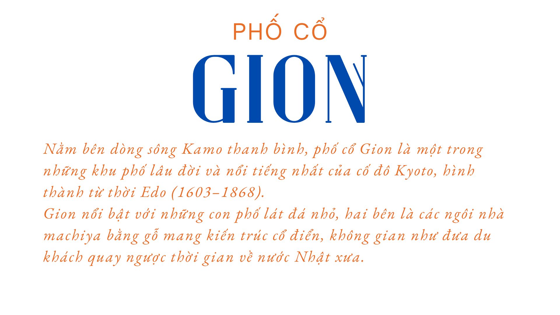 Nằm bên dòng sông Kamo thanh bình, Phố Cổ Gion là một trong những khu phố lâu đời và nổi tiếng nhất của cố đô Kyoto. Hình thành từ thời Edo (1603–1868), Gion ban đầu là khu vực phục vụ khách hành hương đến viếng chùa Yasaka, rồi dần phát triển thành khu giải trí sang trọng với quán trà đạo, quán rượu và đặc biệt là các Geisha— những nghệ nhân nữ chuyên biểu diễn nghệ thuật truyền thống Nhật Bản.