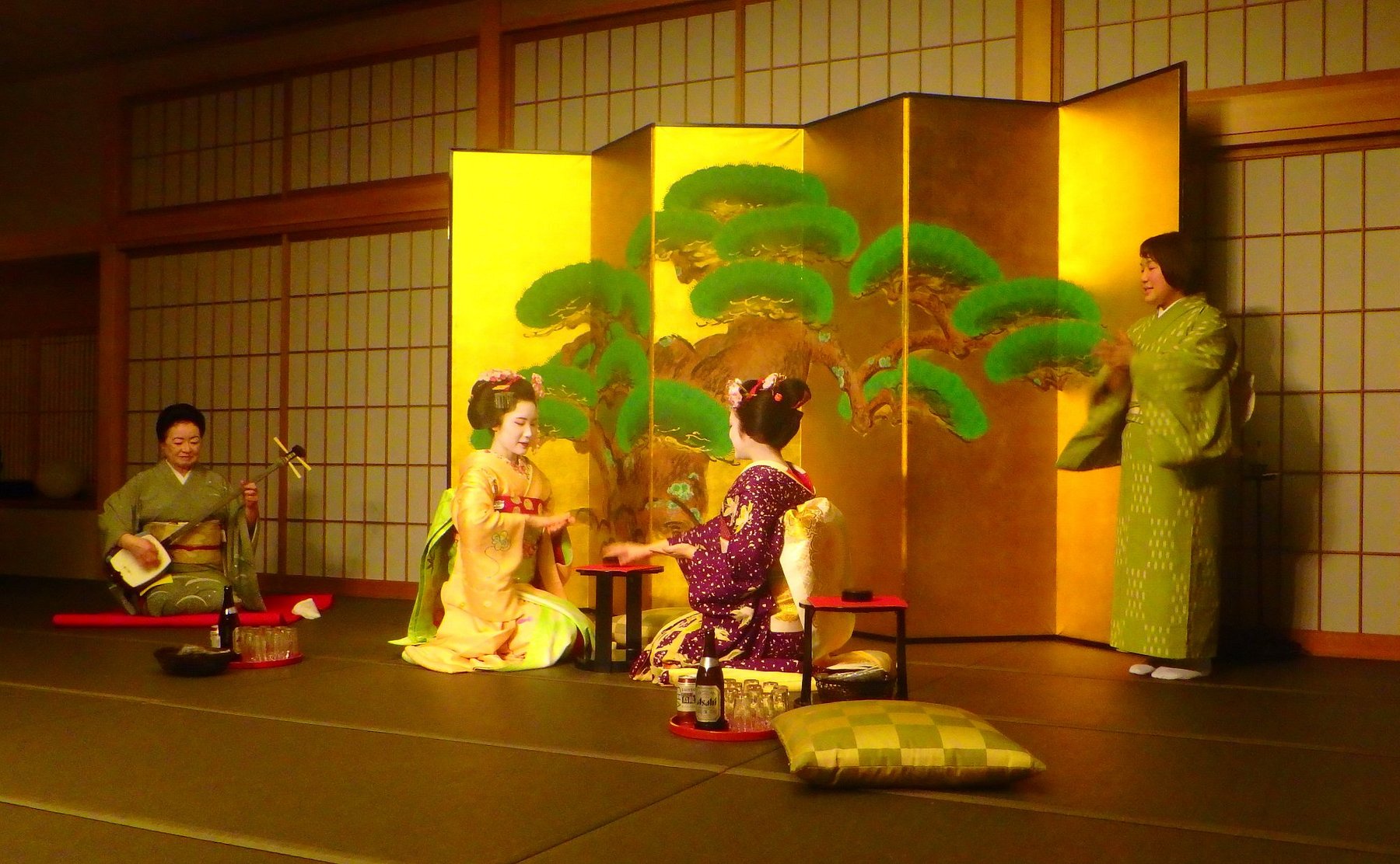 Bên trong Ochaya, thực khách được tiếp đón trong không gian trang nhã với đèn lồng, chiếu tatami và những món ăn kaiseki tinh tế. Geiko và maiko sẽ trình diễn vũ điệu truyền thống, chơi shamisen, hát nhạc cổ và tham gia các trò chơi đối ẩm đầy duyên dáng. Đây từng là nơi lui tới của tầng lớp quý tộc, samurai và thương nhân giàu có xưa kia.