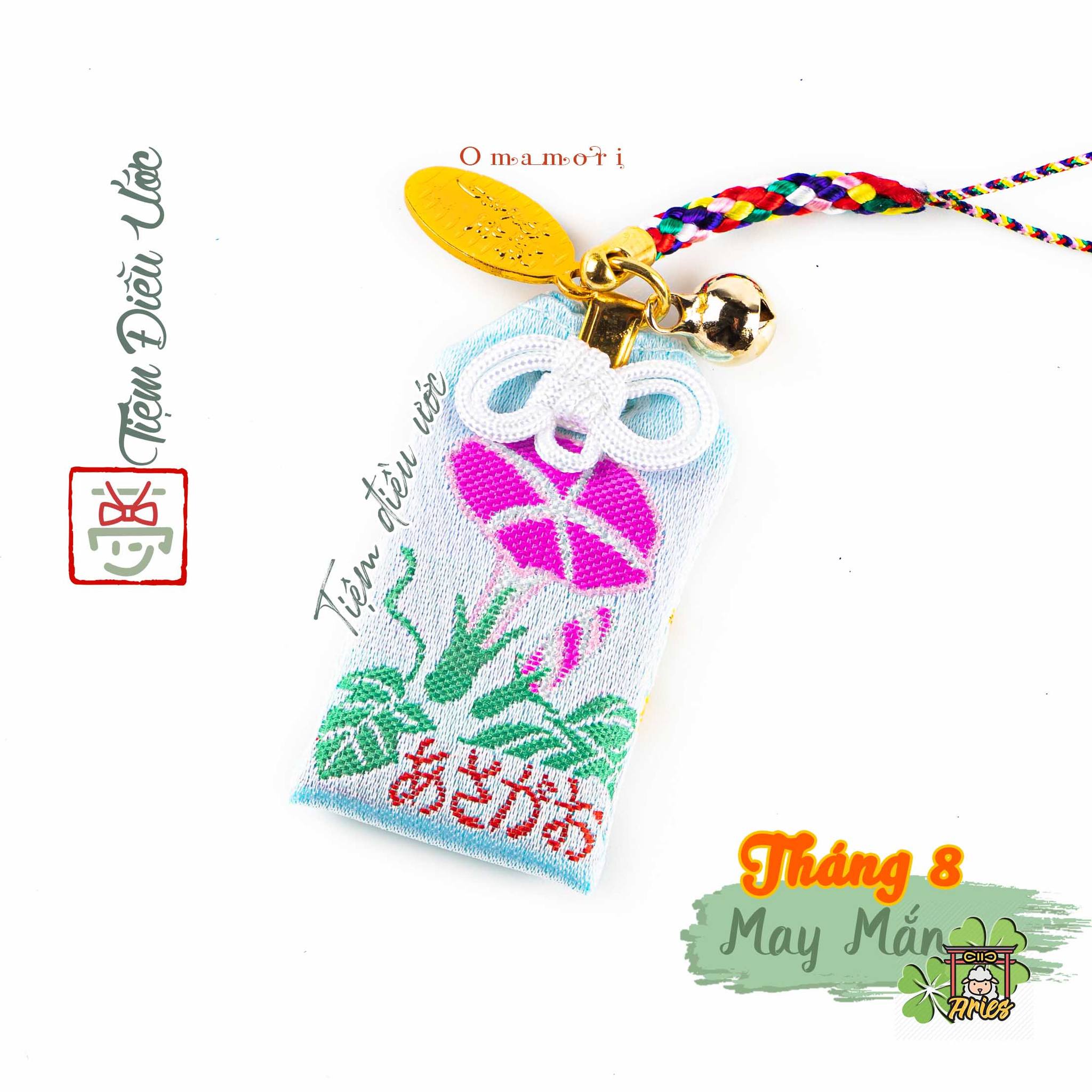 Xuất xứ: Omamori được Tiệm mình đến ngôi Chùa Vàng cực kì nổi tiếng thỉnh về, Trên mặt #Omamori này có hình hoa Bìm Biếc - Asagao. Vì sự nhỏ nhắn đáng yêu này kèm theo sợi dây được kèm sợi dây nhỏ nhỏ, bạn có thể treo ốp điện thoại, treo túi/giỏ, móc khóa, hơi bị dễ thương đó nha! có cái chuông gọi vận may nữa đó!