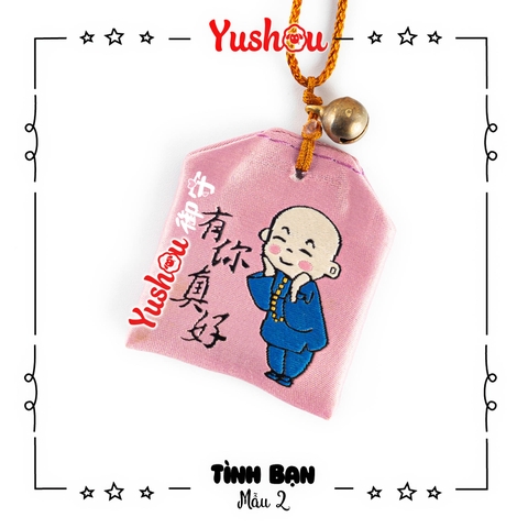 Trung tâm của yushou là hình ảnh một chú tiểu đang mỉm cười hiền lành, ngồi cạnh một chú thỏ trắng đáng yêu, biểu tượng cho sự trong sáng, gắn kết và sự đồng hành trong tình bạn. Bên cạnh đó, yushou còn có dòng chữ Hán tự "珍惜擁有" (Trân Tích Dũng Hữu), có nghĩa là "trân trọng những gì đang có", gợi nhắc về giá trị của những mối quan hệ hiện tại. Yushou được gắn với một sợi dây màu nâu và một chiếc chuông nhỏ bằng kim loại màu vàng đồng, tăng thêm vẻ đẹp và sự tinh tế. yushou có dây dài, thích hợp cho bạn treo vào cặp, móc khóa hoặc dành để tặng người thân bạn bè mình nhé!