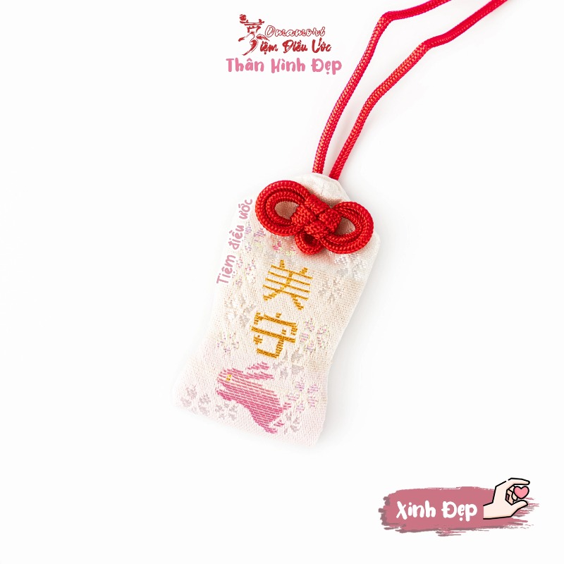 Đặc điểm: Sự đặc biệt của Omamori này là hình dáng bên ngoài, được thắc eo nhẹ, thấy lạ rồi ha! có bé thỏ Unegai dễ thương trên nền Hoa Anh Đào, vừa nhẹ nhàng, duyên dáng vừa xinh xắn