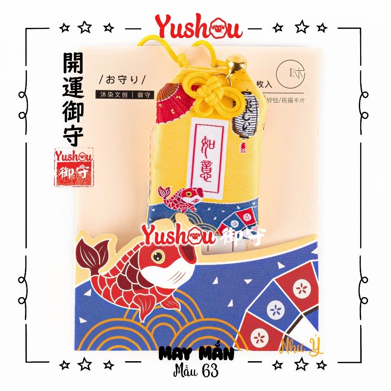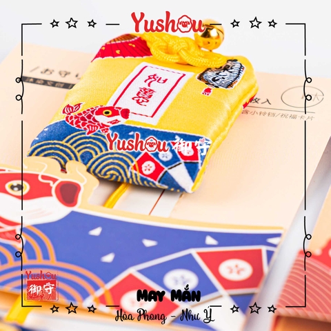 Mẫu yushou được dệt hình cá chép may mắn và quạt giấy, lồng đèn trên nền màu vàng, yushou có kèm tag giấy để ghi nguyện vọng sau đó để vào bên trong túi, yushou có dây dài, thích hợp cho bạn treo vào cặp, móc khóa hoặc dành để tặng người thân bạn bè mình nhé!